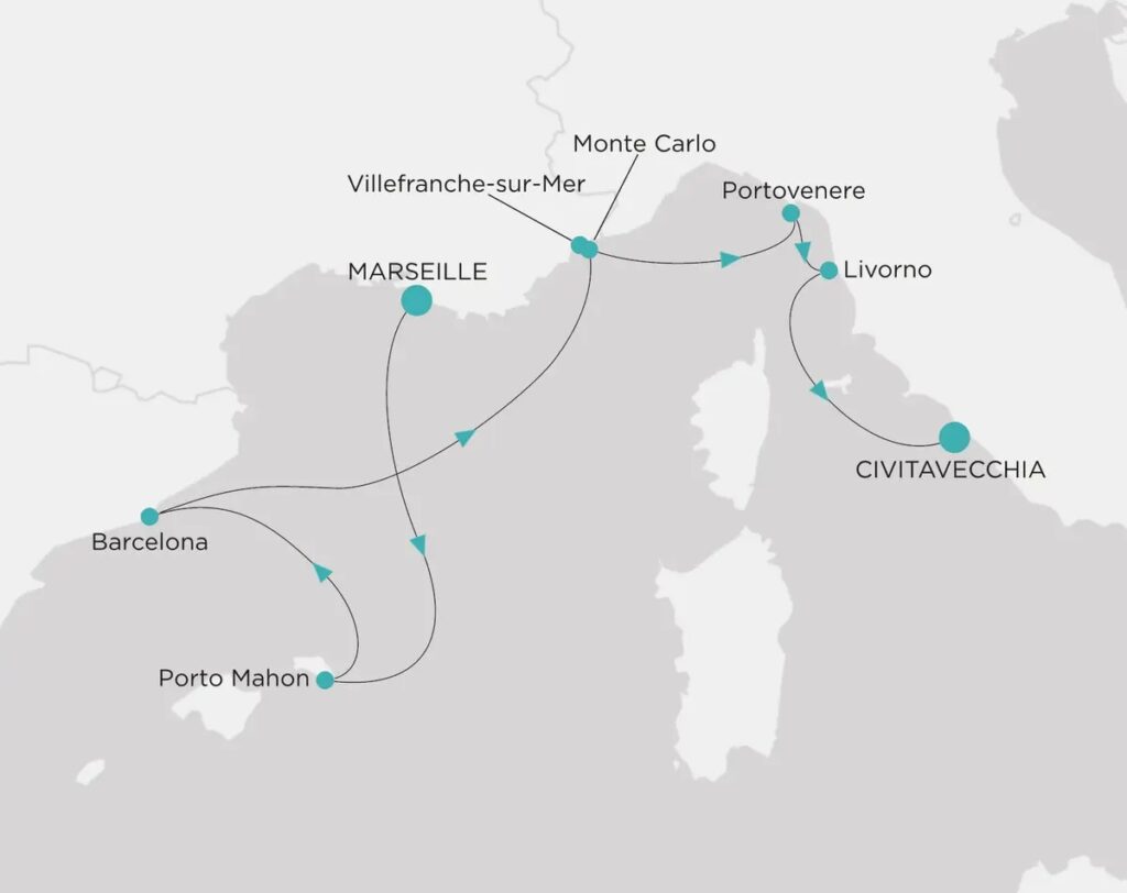 Begin your journey in Marseille, France’s second-largest city, rich with Mediterranean flavors and modern art.