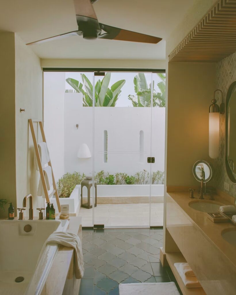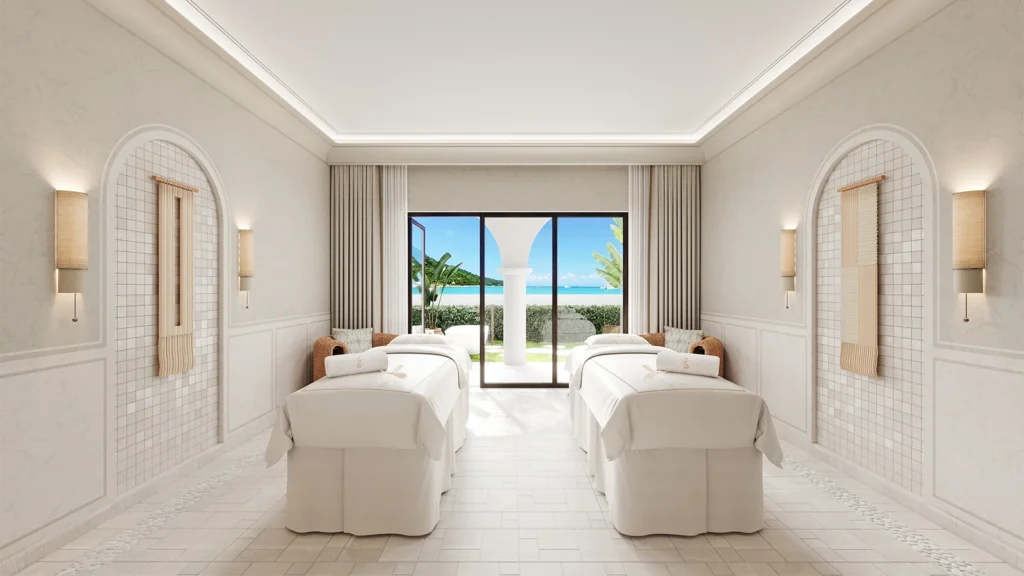 - Villas y suites frente al mar: Retiros espaciosos con detalles de mármol, interiores artesanales y vistas ininterrumpidas al mar Caribe.
