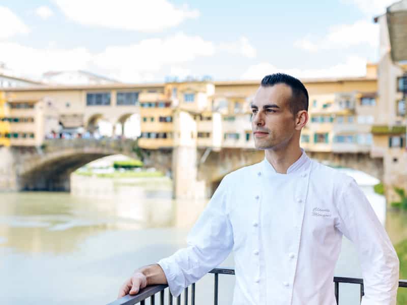 El chef Claudio Mengoni combina técnicas contemporáneas con influencias tradicionales toscanas. Sus platos reflejan una preparación precisa y una presentación elegante, celebrando la herencia culinaria de Italia.