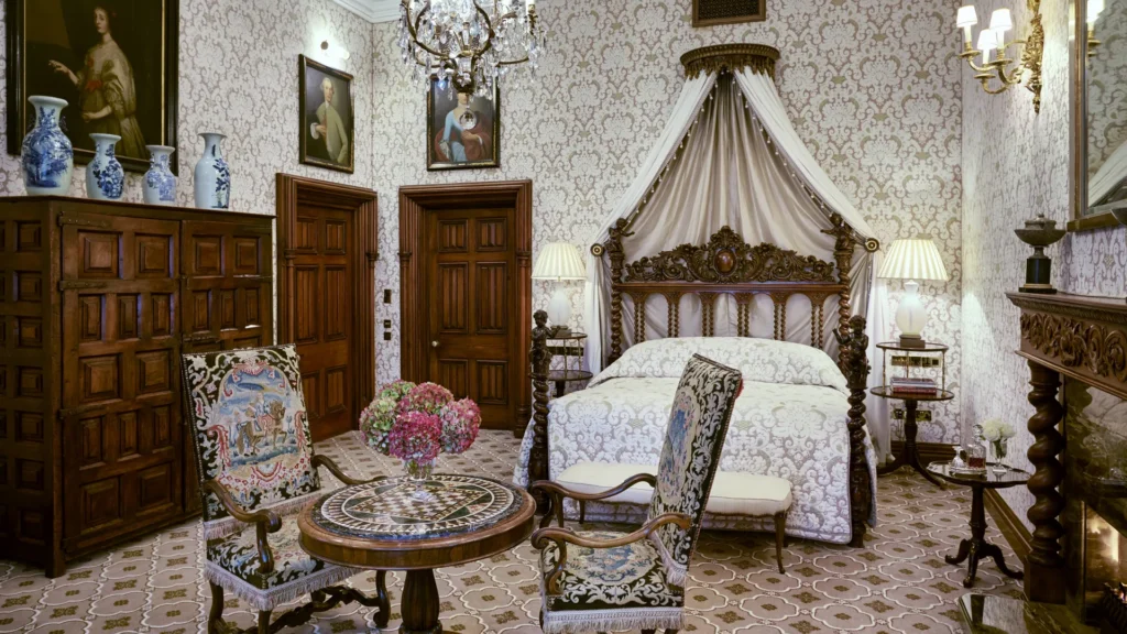 Además, cada alojamiento cuenta con chimeneas encendidas, mobiliario antiguo y vistas panorámicas de las 350 acres onduladas de la finca. La Suite Reagan, nombrada así en honor al expresidente que se alojó aquí, ejemplifica el compromiso del castillo con el servicio y la comodidad presidenciales.