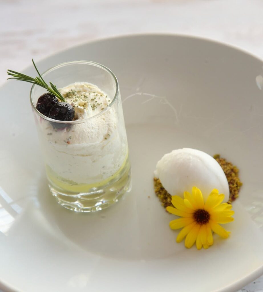 En parlant de desserts, ne laissez pas tomber les glaces maison. Ces créations emblématiques sont réalisées sur place à partir de fruits et d’herbes cueillis directement dans le verger du restaurant.