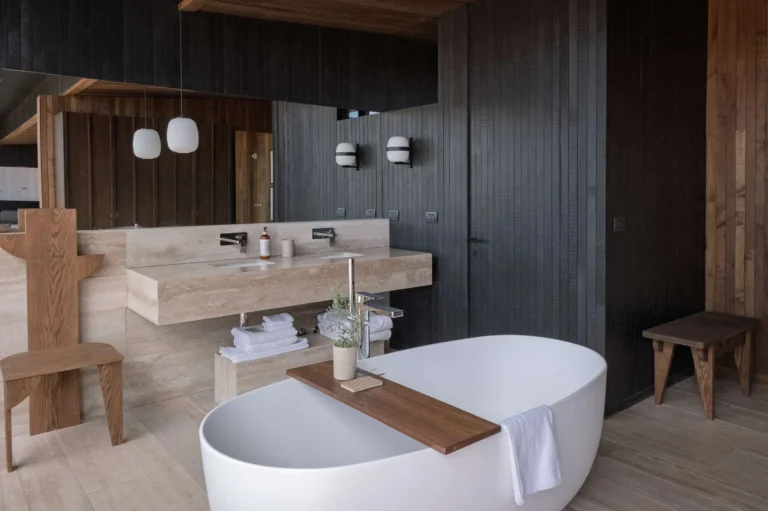The hotel features 28 elegantly designed rooms and suites that bring the desert landscape indoors. Each offers private terraces or patios, deep-soaking tubs, and handcrafted furnishings accented with desert-inspired hues. Floor-to-ceiling windows frame sweeping views of volcanic peaks and allow guests to stargaze from the comfort of their room.