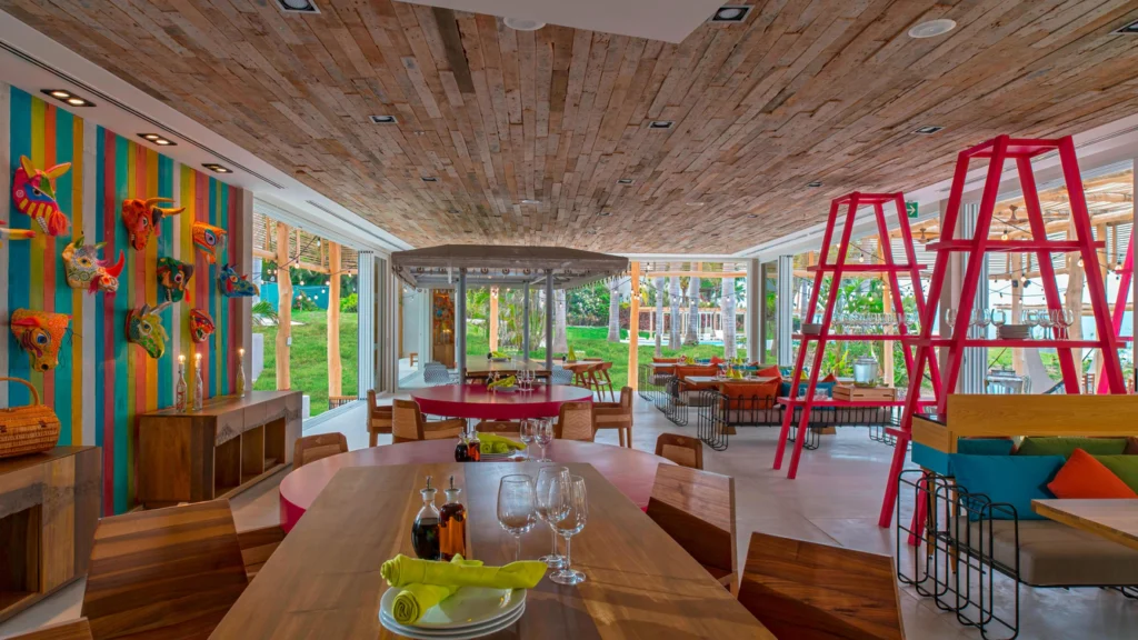 adorned with bold striped walls, intricate animal masks, and handcrafted Mexican glassware, every detail creates a festive yet authentic ambiance.