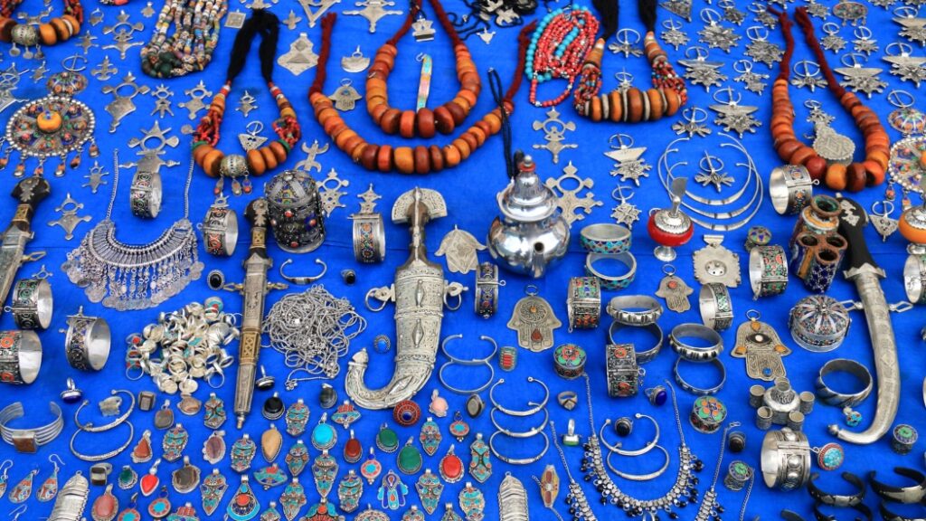 A joalheria no Marrocos vai muito além do simples adorno — ela reflete identidades tribais e histórias pessoais. A prata é o meio preferido pela maioria do país devido à sua pureza simbólica. Os designs costumam ser ousados e intrincados, com cada peça tão única quanto uma impressão digital.