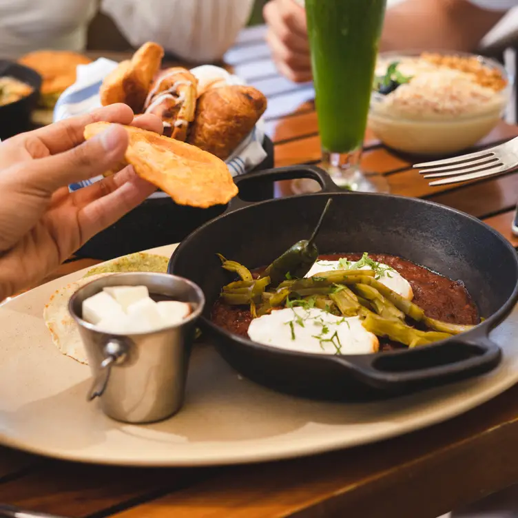 - Pink chilaquiles with avocado and eggs
